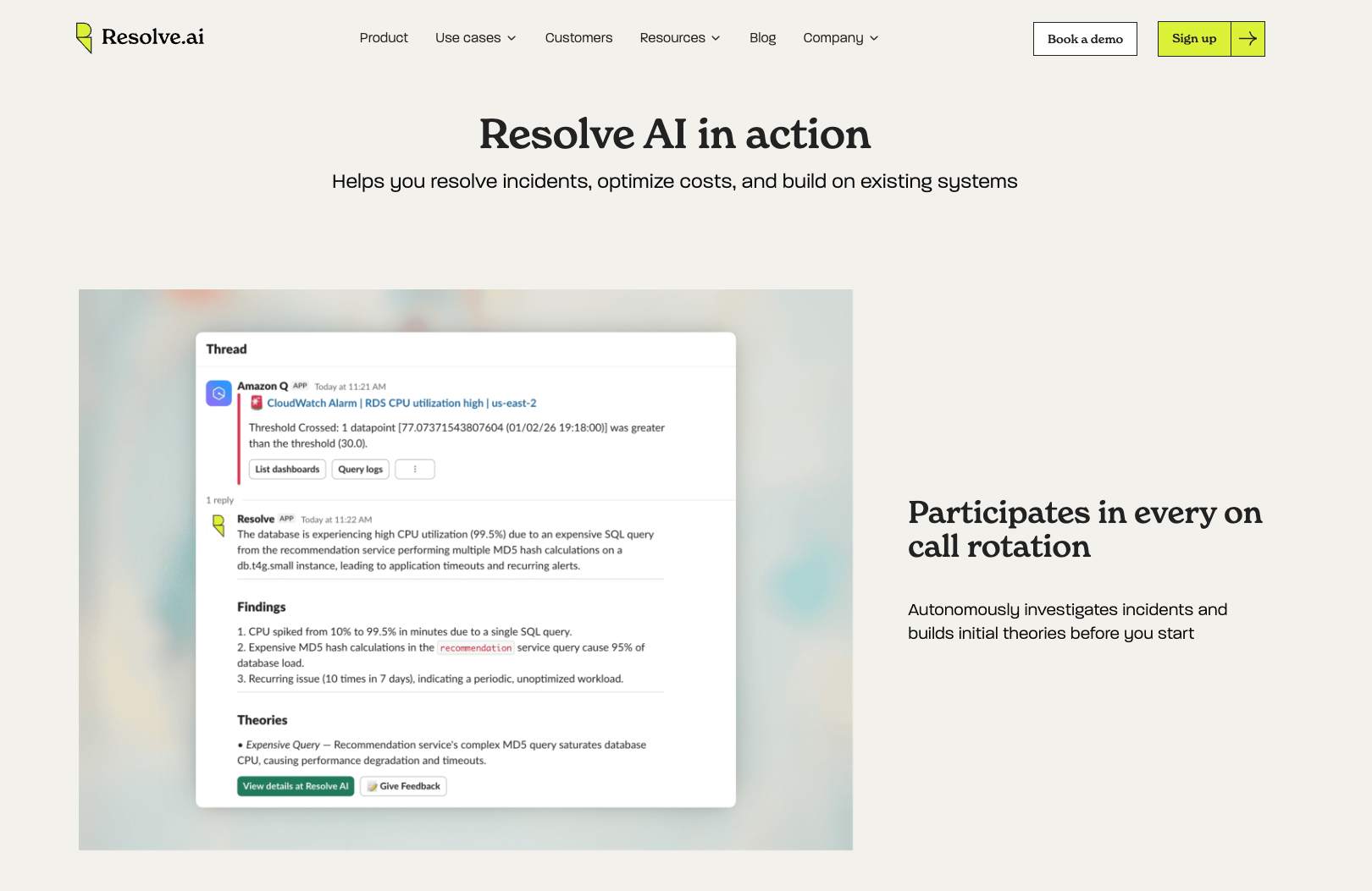 Resolve AI のエージェントは、導入企業ごとのスタック、ビジネスロジック、過去のインシデント履歴を学習します。「その会社のシステムを知っている AI」が障害対応にあたるわけで、これが既存のモニタリングツールとの大きな違いになっています。